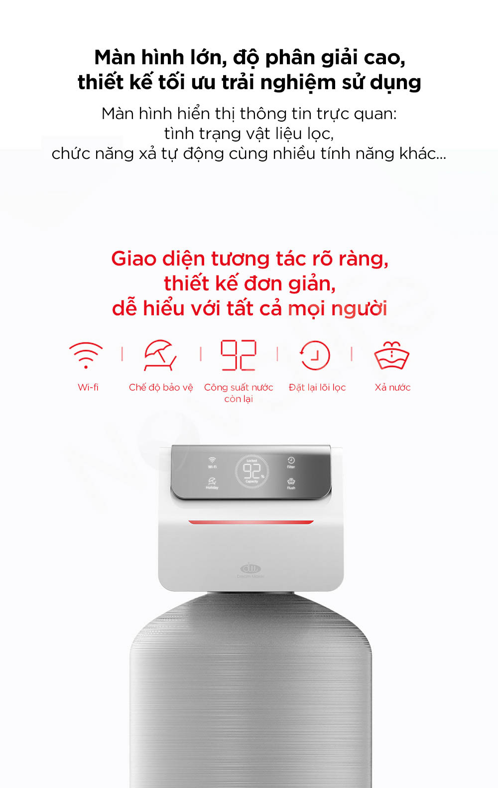 Hệ thống được trang bị màn hình kích thước lớn, độ phân giải cao, thiết kế tối ưu trải nghiệm người dùng. Màn hình hiển thị rõ ràng các thông tin quan trọng như tình trạng vật liệu lọc, chức năng xả tự động và các chế độ vận hành khác. Giao diện đơn giản, trực quan giúp mọi thành viên trong gia đình đều có thể theo dõi và sử dụng hệ thống một cách dễ dàng.