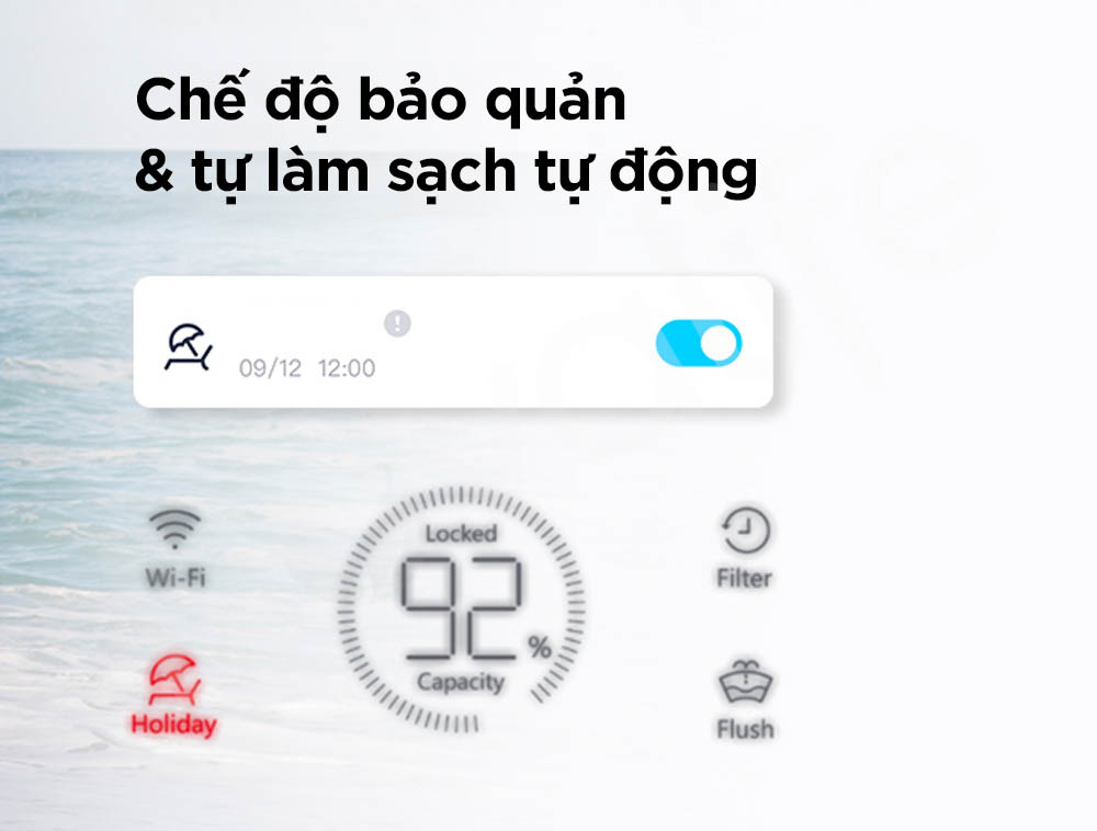 Hệ thống cho phép theo dõi và kiểm soát chất lượng nước tại nhà từ xa, ngay cả khi người dùng không có mặt. Khi đi công tác hoặc vắng nhà trong thời gian dài, chỉ cần kích hoạt chế độ bảo vệ thông minh để thiết bị tự động vận hành theo chu trình an toàn. Hệ thống chủ động xả rửa định kỳ, ngăn ngừa nước tồn đọng và hạn chế sự phát triển của vi khuẩn, đảm bảo nguồn nước luôn sạch và sẵn sàng khi gia đình trở về.
