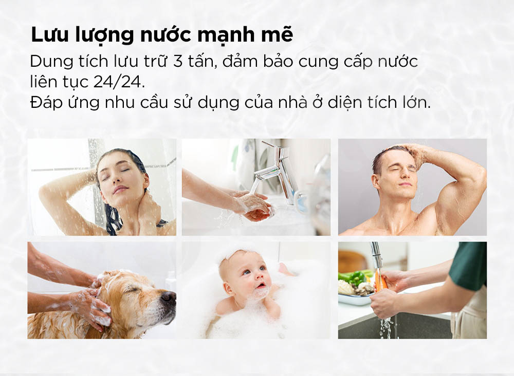 Hệ thống sở hữu lưu lượng nước mạnh mẽ, đáp ứng hiệu quả nhu cầu sử dụng của các ngôi nhà có diện tích lớn. Với dung tích lưu trữ lên đến 3 tấn, thiết bị đảm bảo khả năng cấp nước ổn định và liên tục 24/24, kể cả trong giờ cao điểm. Thiết kế tối ưu cho nhiều người dùng và nhiều điểm sử dụng đồng thời, mang lại trải nghiệm sử dụng nước liền mạch, tiện nghi và an tâm cho gia đình đông thành viên.