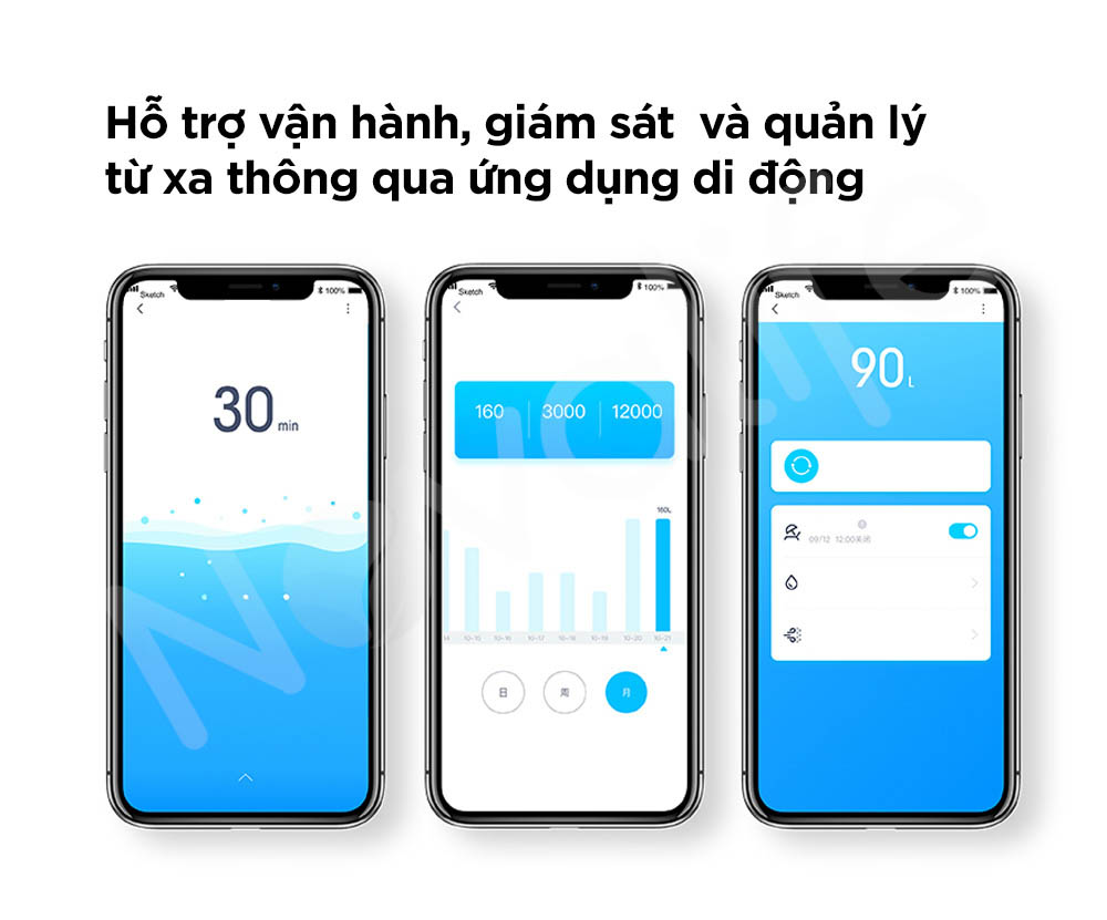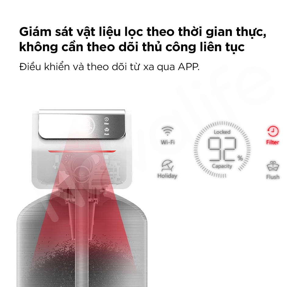Hệ thống cho phép theo dõi trạng thái vận hành và tình trạng vật liệu lọc theo thời gian thực, giúp người dùng không cần kiểm tra thủ công thường xuyên.
