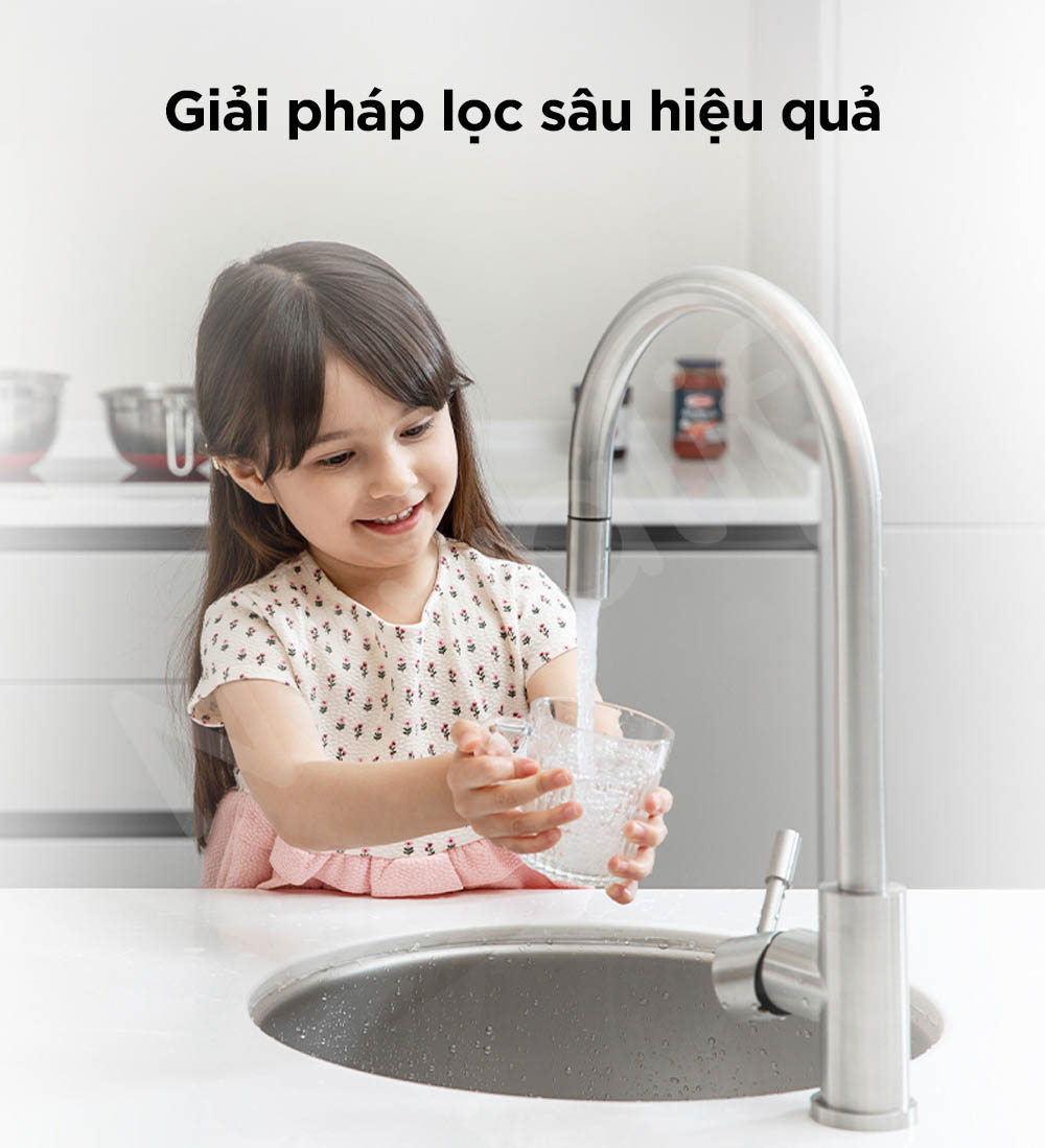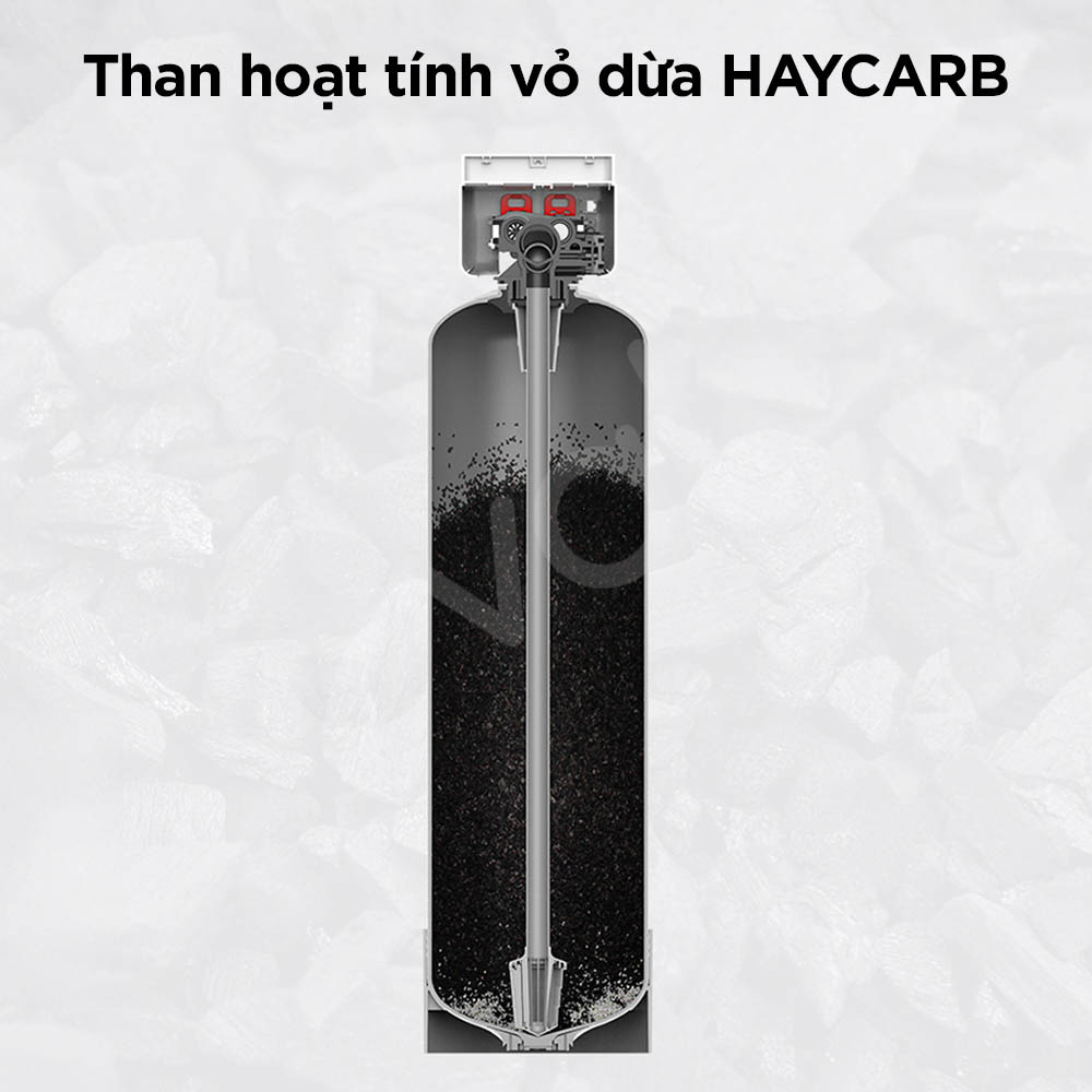 Hệ thống sử dụng than hoạt tính cao cấp HAYCARB từ vỏ dừa với chỉ số i-ốt trên 1100 mg/g, vượt trội so với mức tiêu chuẩn thông thường 750–950 mg/g dành cho nước uống. Nhờ hiệu suất hấp phụ cao, than hoạt tính HAYCARB giúp loại bỏ clo dư hiệu quả, đồng thời cải thiện rõ rệt chất lượng, mùi và độ an toàn của nguồn nước, mang đến trải nghiệm sử dụng nước sạch và an tâm cho cả gia đình.
