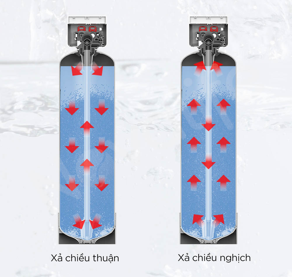 Hệ thống lọc nước trung tâm được trang bị công nghệ xả hai chiều thông minh, giúp làm sạch vật liệu lọc hiệu quả, đảm bảo vệ sinh toàn bộ hệ thống và duy trì hiệu suất ổn định trong thời gian dài. Cơ chế xả bao gồm: