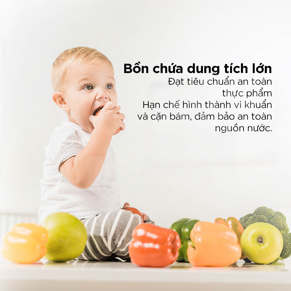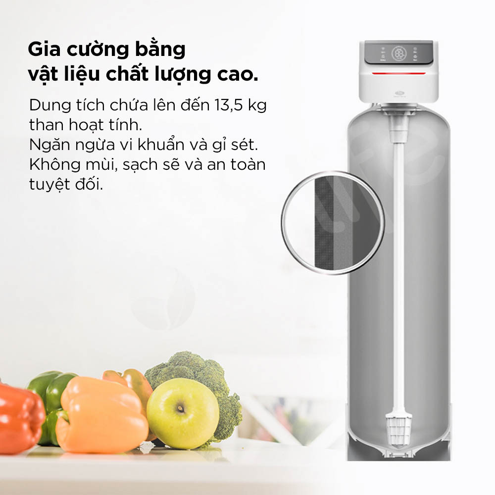 Hệ thống sở hữu bồn chứa dung tích lớn, được gia cố chắc chắn và đáp ứng tiêu chuẩn an toàn thực phẩm, giúp hạn chế hình thành vi khuẩn và cặn bám, đảm bảo nguồn nước luôn sạch và an toàn. Bồn chứa được thiết kế tối ưu với khả năng chứa tới 13,5 kg than hoạt tính, qua đó nâng cao hiệu quả lọc và kéo dài tuổi thọ vật liệu. Cấu trúc bền vững giúp ngăn ngừa vi khuẩn và gỉ sét phát sinh, không mùi, sạch sẽ và an toàn tuyệt đối cho nước sinh hoạt hằng ngày.
