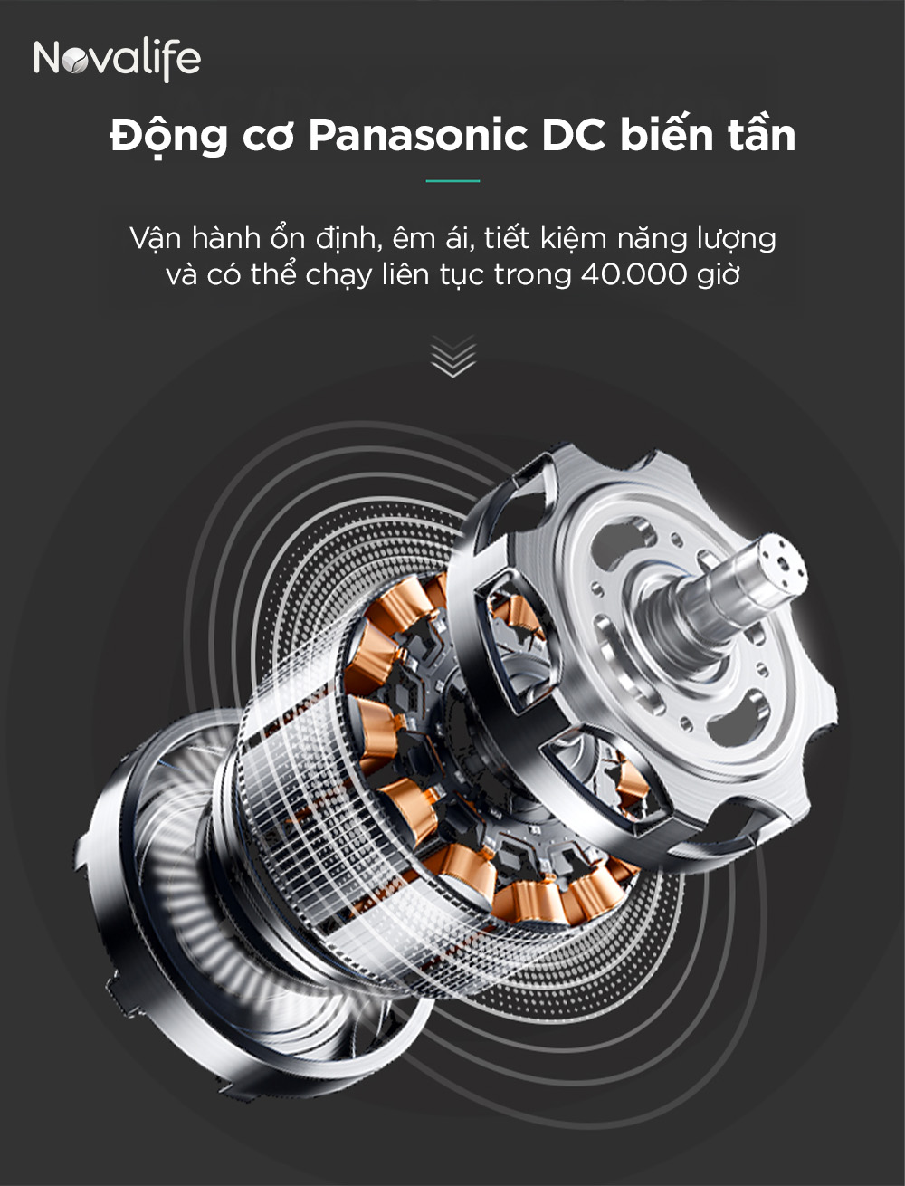 Novalife KMC-50THP được trang bị động cơ DC Panasonic chính hãng, sản xuất tại Nhật Bản – công nghệ bền bỉ tạo nên sự khác biệt vượt trội so với các dòng máy thông thường.