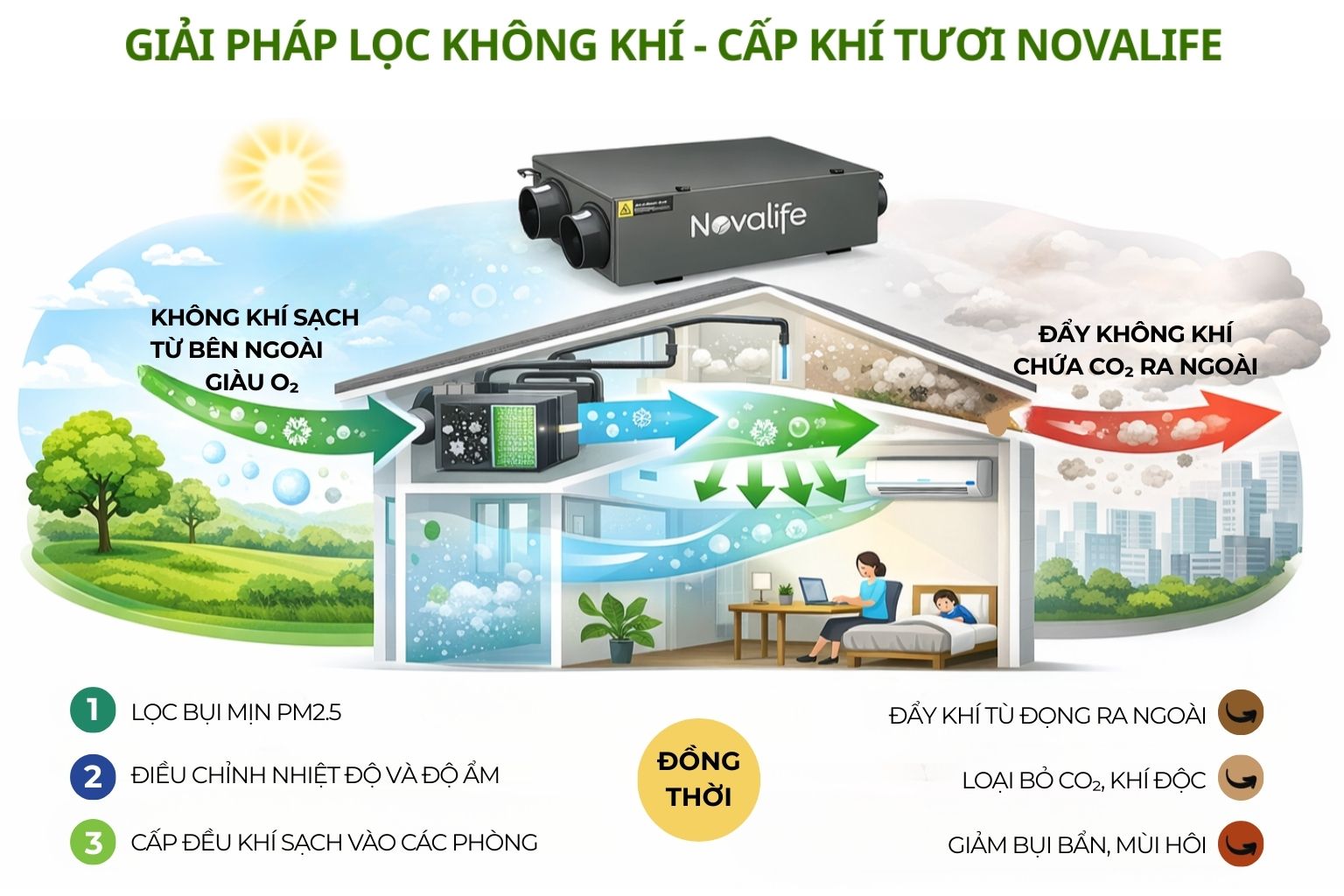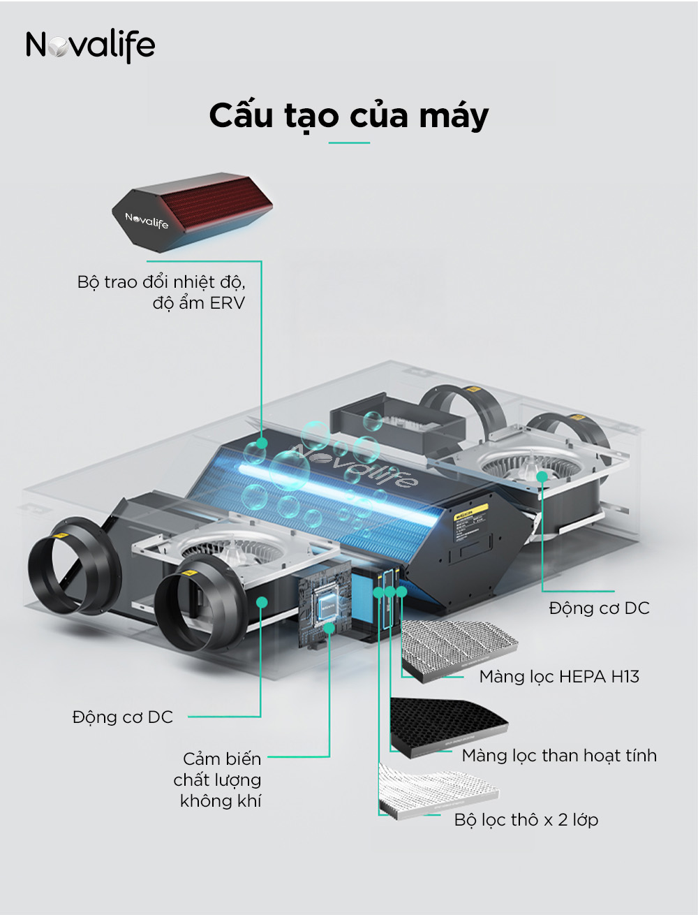 Bên cạnh đó, các hệ thống của Novalife được thiết kế với công suất cao so với tầm giá, phù hợp cho những không gian lớn như biệt thự, nhà ở diện tích rộng và căn hộ cao cấp, nơi yêu cầu cao về lưu lượng khí và độ ổn định khi vận hành liên tục.