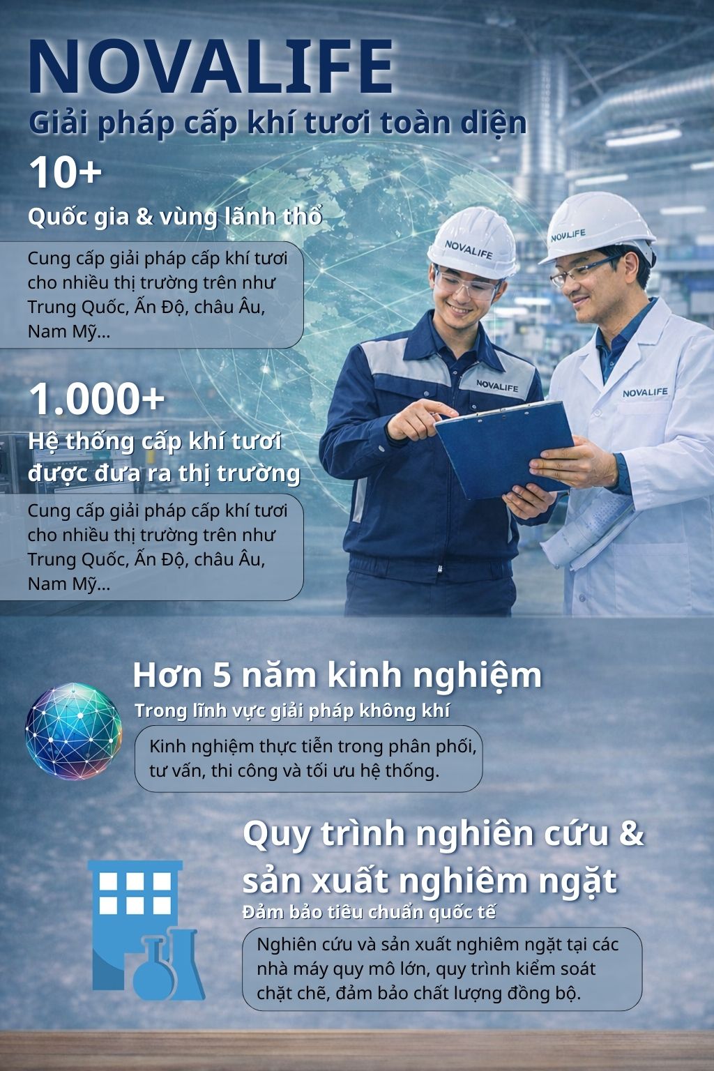 Novalife cung cấp giải pháp cấp khí tươi cho nhiều thị trường toàn cầu, bao gồm các quốc gia có thách thức lớn về ô nhiễm không khí như Trung Quốc, Ấn Độ, châu Âu, khu vực Nam Mỹ… đáp ứng các tiêu chuẩn khắt khe về hiệu suất và độ bền.